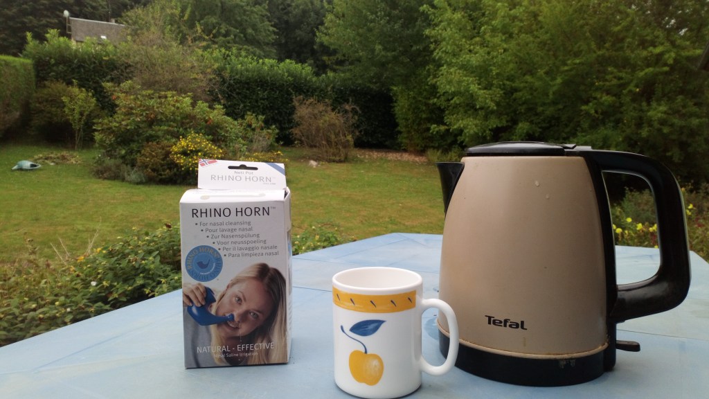ネティポットに38℃くらいのお水とお塩(生理食塩水)を入れ、顔少し傾けて、片方の鼻腔から注ぎます。