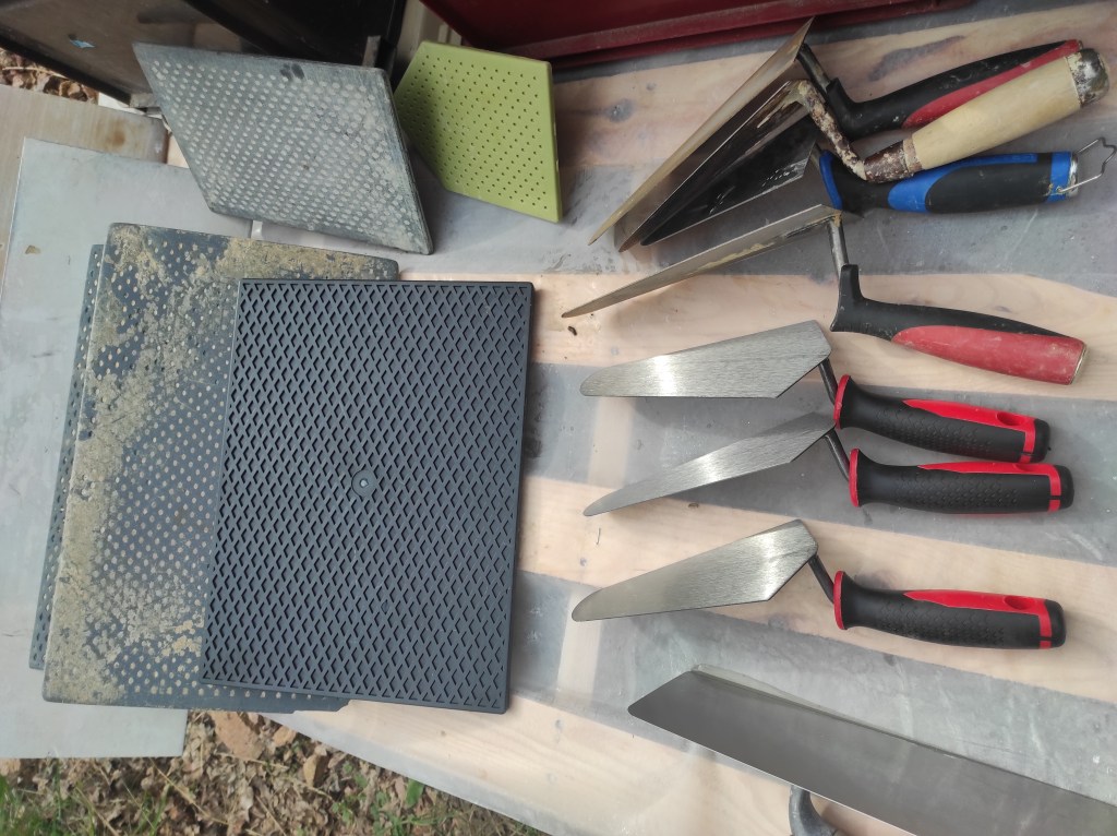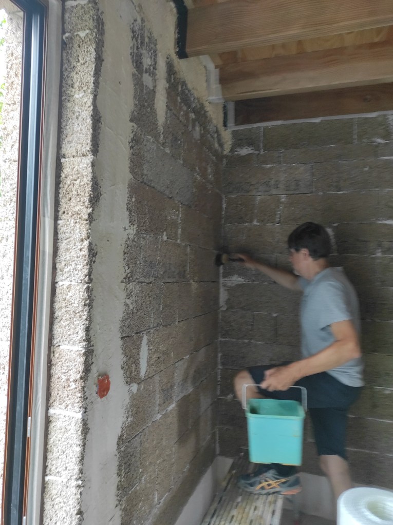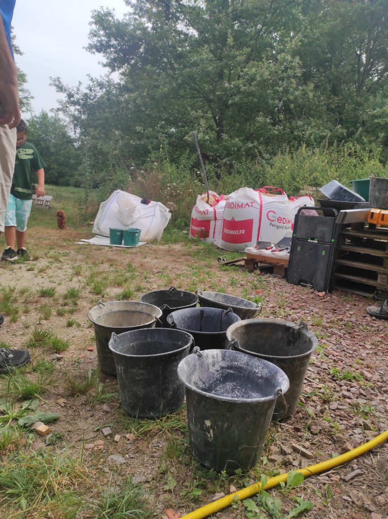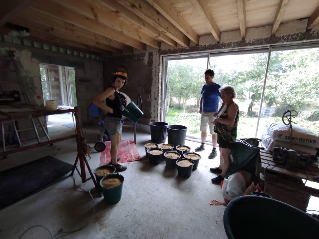 Fabrication des mélanges au pétrin, application d’un épais mélange de terre -sable pour dresser les murs, puis pose de l’enduit terre en suivant et lissage à la taloche.