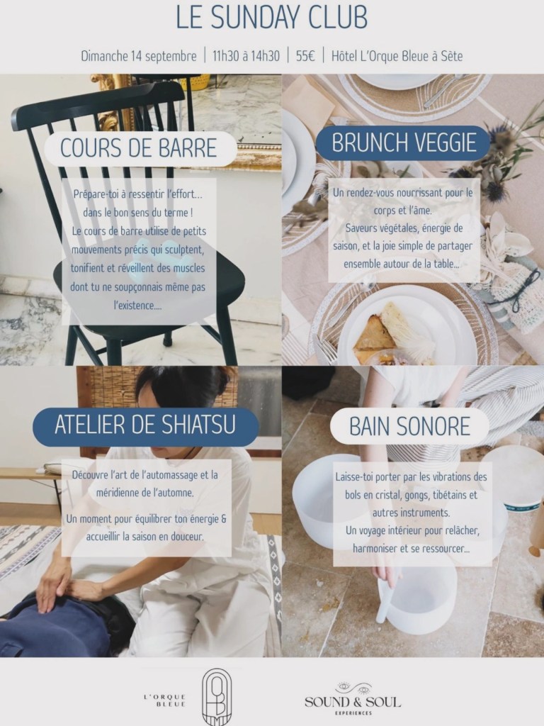 Ce dimanche 14 septembre 2025, un atelier animé par Sound & Soul @sound.soul.sete aura lieu à l’Hôtel Orque Bleu.